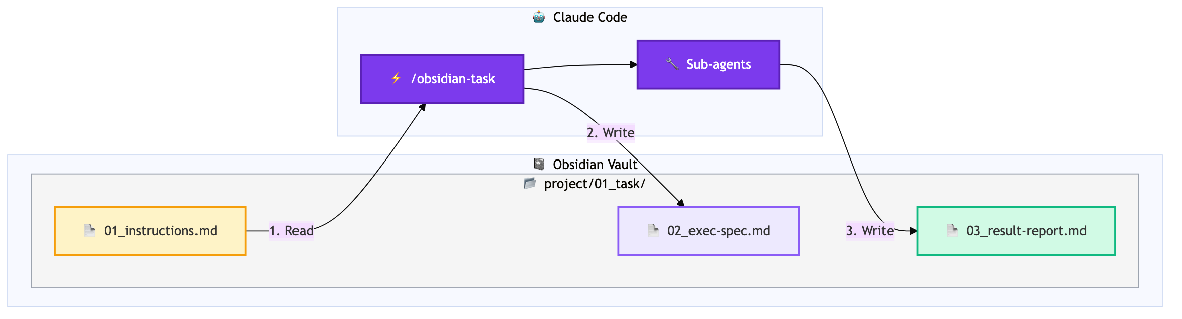 With this single command, instruction files within Obsidian Vault are automatically found and loaded. It searches using fuzzy matching, so entering project/01 will find the project/01_task-name directory.